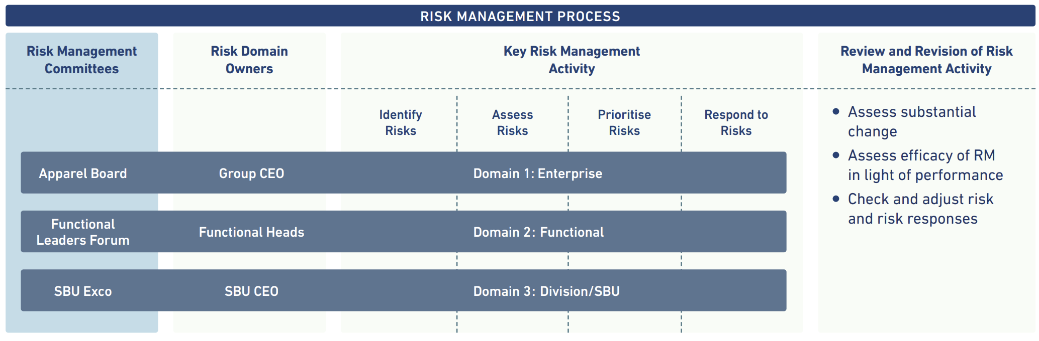 The MAS Holdings Board holds oversight responsibility for risk and opportunity management, ensuring the effectiveness of risk management and internal control systems across the Organisation. MAS takes a proactive approach to risk and opportunity management using a comprehensive Enterprise Risk Management structure, which is based on the COSO framework. Our framework acts as our roadmap for identifying, prioritising, effectively managing risks across the entire Organisation. This framework seamlessly aligns with our organisational structure, with specifically classified risk domains and clear risk assessment criteria that ensures consistent application across all risk types. Beyond identification and assessment, the framework extends to risk oversight and reporting. Accountability and responsibility for risk are distributed across the Organisation, ensuring dedicated resources and structured risk review processes across the relevant risk domains. This comprehensive approach is further strengthened by clear lines of oversight within our governance structures, setting the tone for a risk-aware organisation.